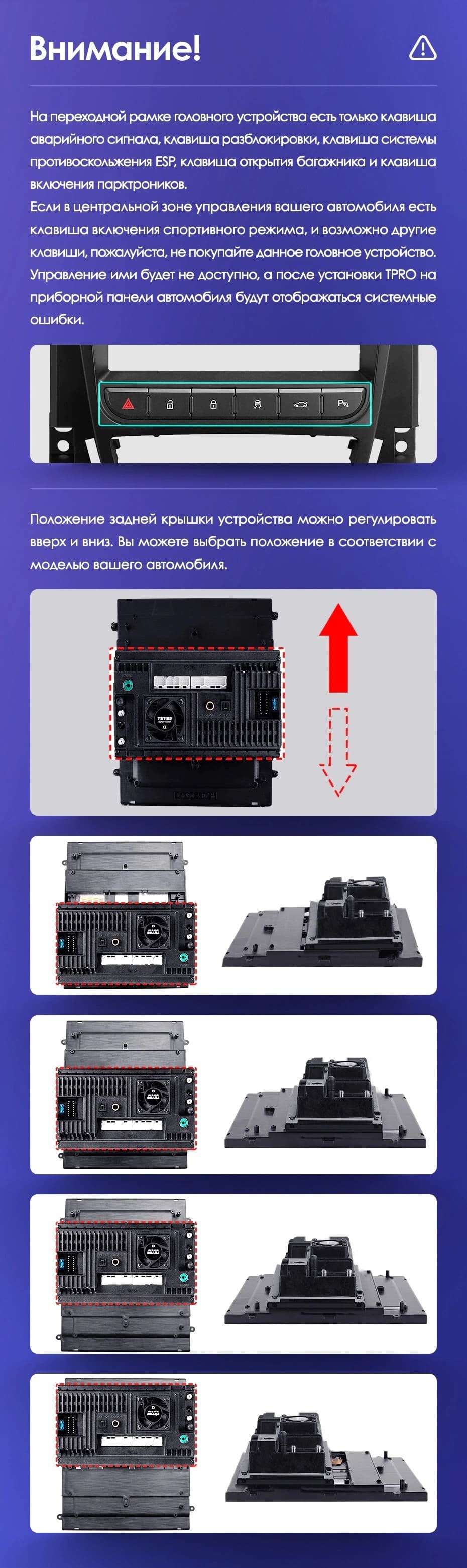 Вертикальная установка магнитолы закрывается специальной рамкой под определённый автомобиль. Утончённый, лаконичный дизайн Teyes TPRO 2 подойдёт под любую премиальную обшивку салона. Большой выбор цветовых решений интерфейса позволяет создавать индивидуальное оформление, чтобы мерцания и анимации на мониторе не отвлекали от езды. Teyes TPRO 2 - это симбиоз передовых технологий, созданный для вашего комфорта и безопасности.