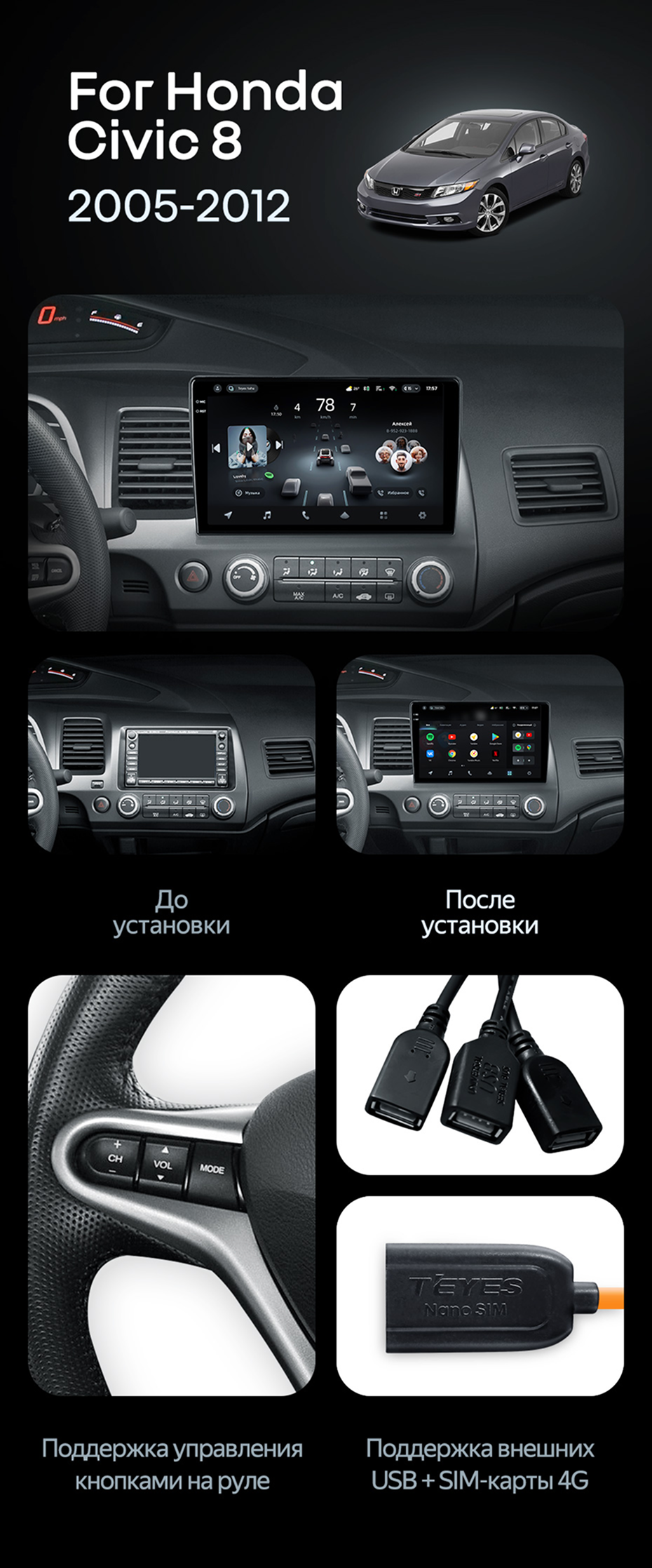 Штатная магнитола Teyes CC4 Pro 12/256 Honda Civic 8 FK FN FD (2005-2012) - купить всего за 65 750 руб. в интернет-магазине в Иркутске Teyes.com.ru. ✓ Самый лучший выбор мультимедиа ✓ Лучшая замена штатному ГУ ✓ Тел. +7 (800) 775-31-74