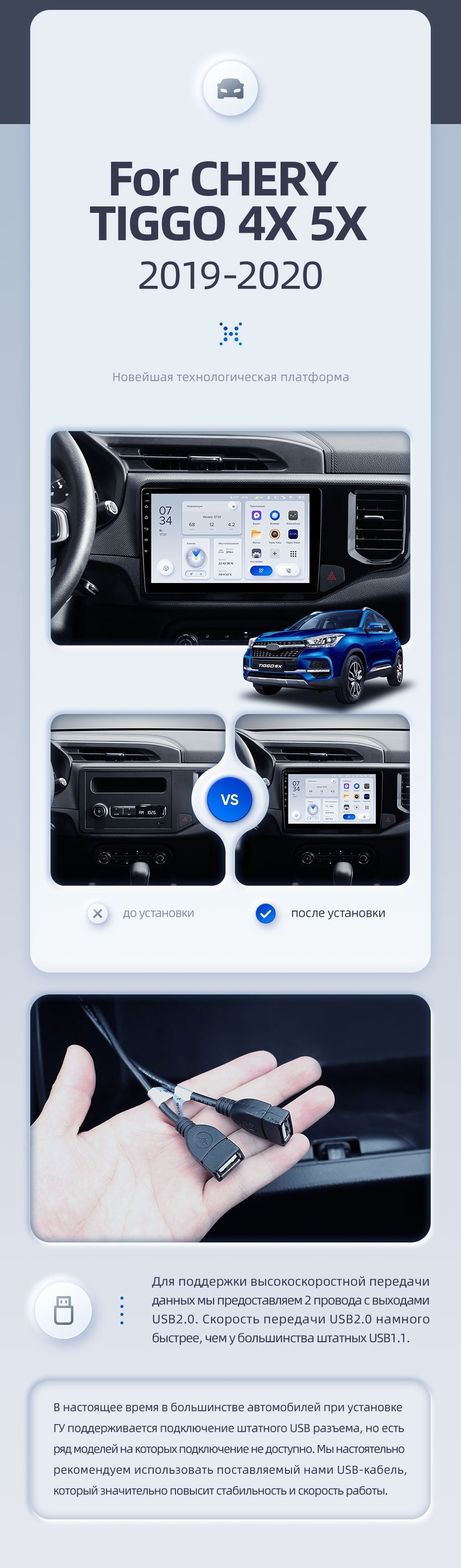 | USB | 3×USB 2.0 + USB 3.0 | Доп. аксессуары | Передняя/задняя AHD-камера, DVR-регистратор, TPMS, парковочный OBD, Type-C → HDMI |