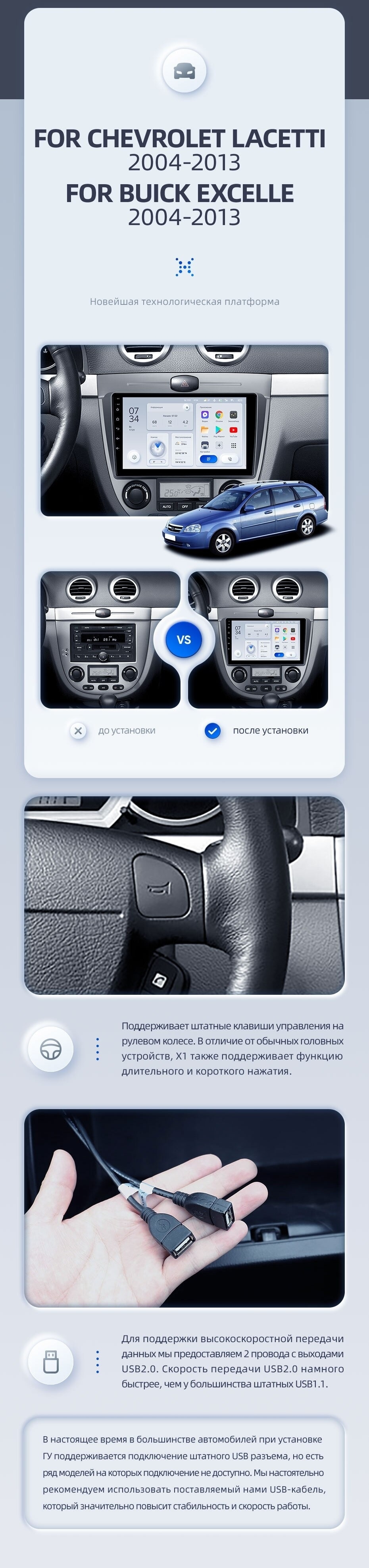 | USB | 3×USB 2.0 + USB 3.0 | Доп. аксессуары | Передняя/задняя AHD-камера, DVR-регистратор, TPMS, парковочный OBD, Type-C → HDMI |