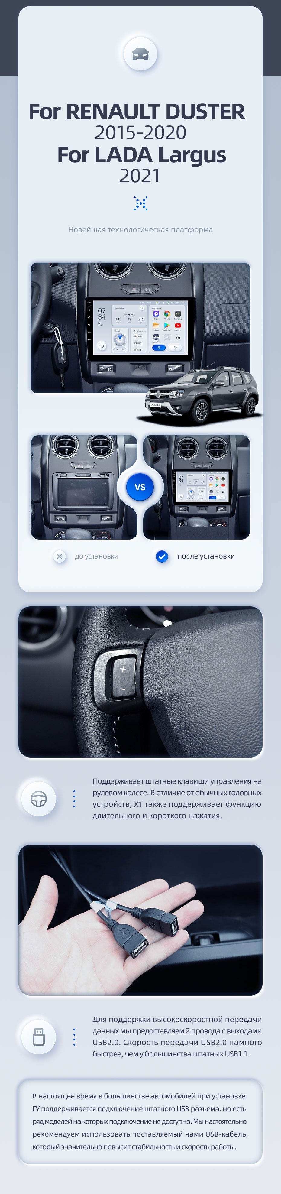 | USB | 3×USB 2.0 + USB 3.0 | Доп. аксессуары | Передняя/задняя AHD-камера, DVR-регистратор, TPMS, парковочный OBD, Type-C → HDMI |