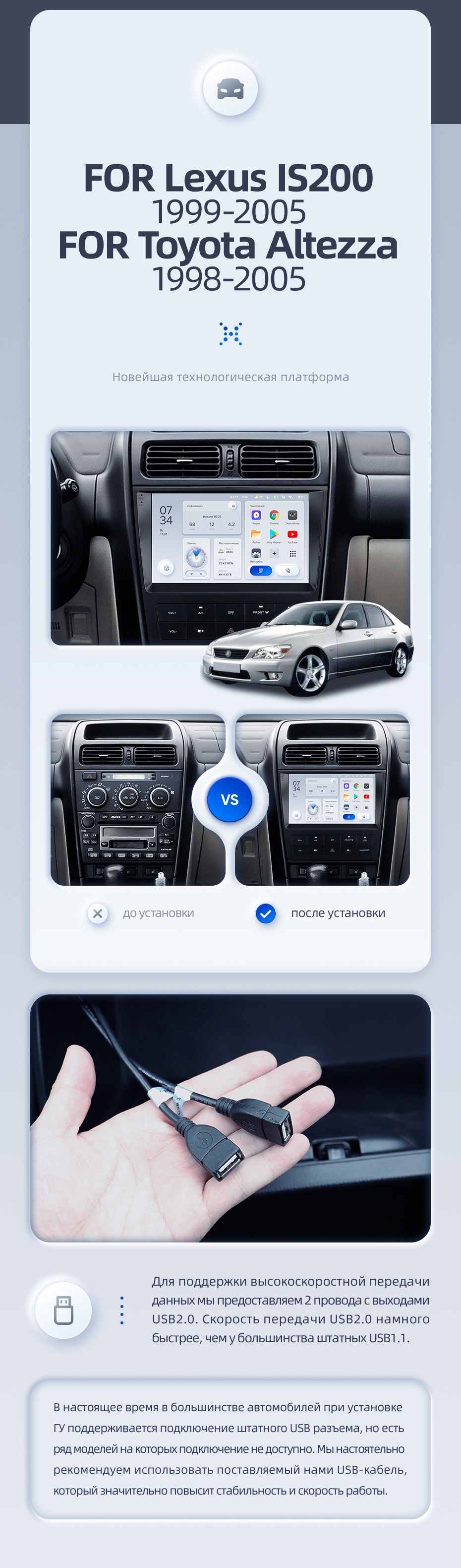 | USB | 3×USB 2.0 + USB 3.0 | Доп. аксессуары | Передняя/задняя AHD-камера, DVR-регистратор, TPMS, парковочный OBD, Type-C → HDMI |