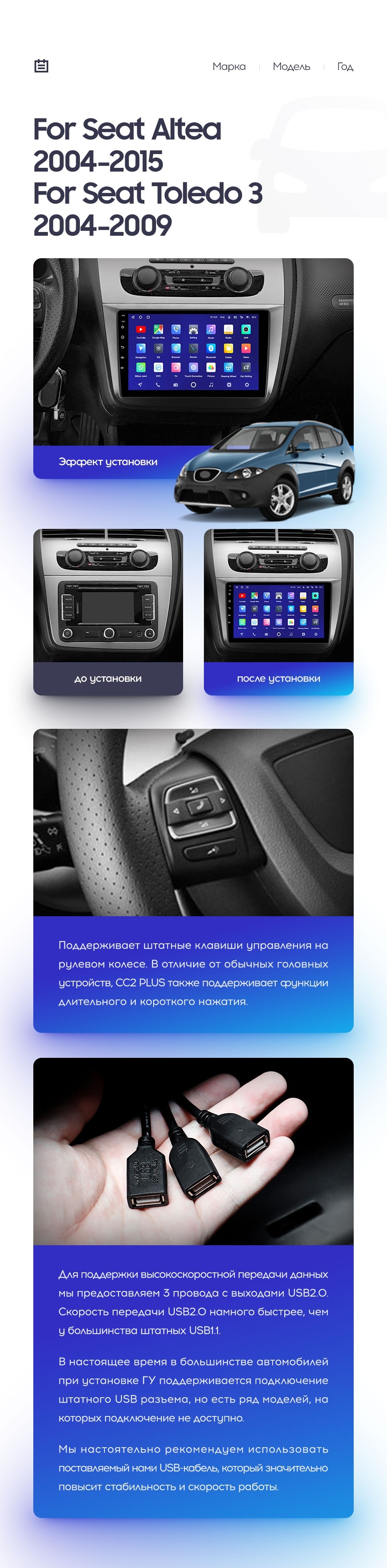 | USB | 3×USB 2.0 + USB 3.0 | Доп. аксессуары | Передняя/задняя AHD-камера, DVR-регистратор, TPMS, парковочный OBD, Type-C → HDMI |