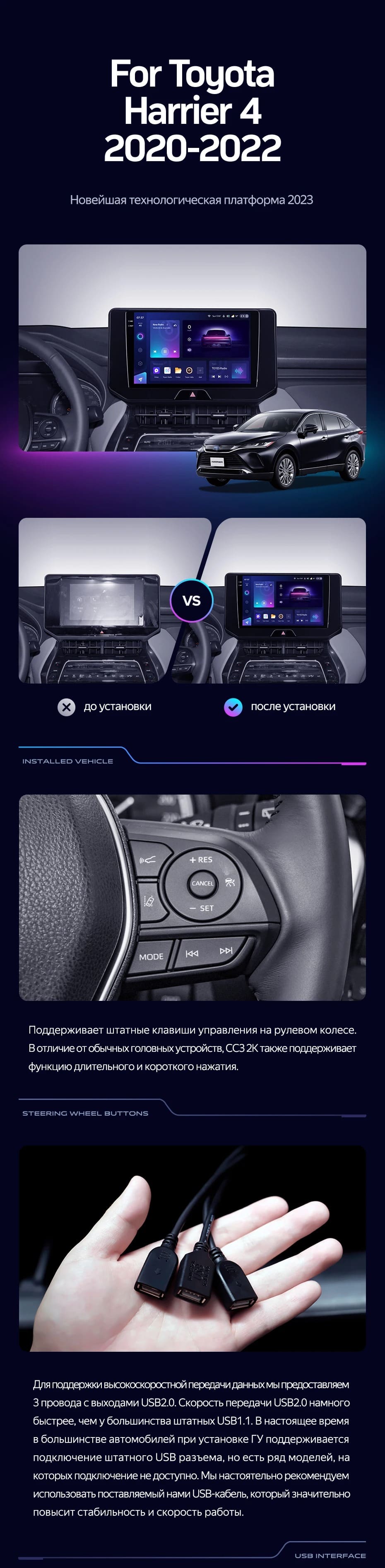 | USB | 3×USB 2.0 + USB 3.0 | Доп. аксессуары | Передняя/задняя AHD-камера, DVR-регистратор, TPMS, парковочный OBD, Type-C → HDMI |