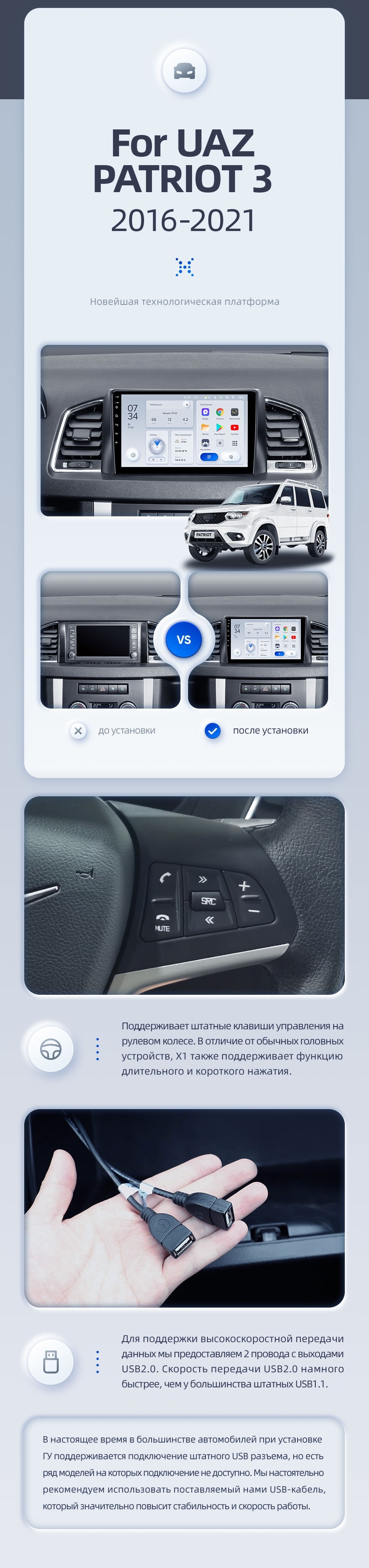 | USB | 3×USB 2.0 + USB 3.0 | Доп. аксессуары | Передняя/задняя AHD-камера, DVR-регистратор, TPMS, парковочный OBD, Type-C → HDMI |