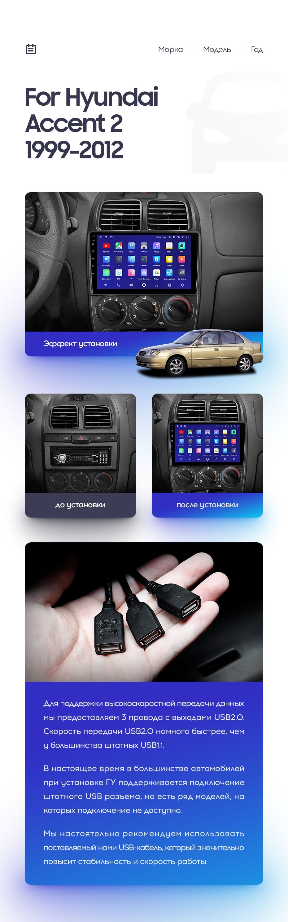 Полный комплект установки магнитолы Teyes с рамкой и проводкой можно выбрать в каталоге штатных магнитол Hyundai Accent II LC2 (1999-2012).