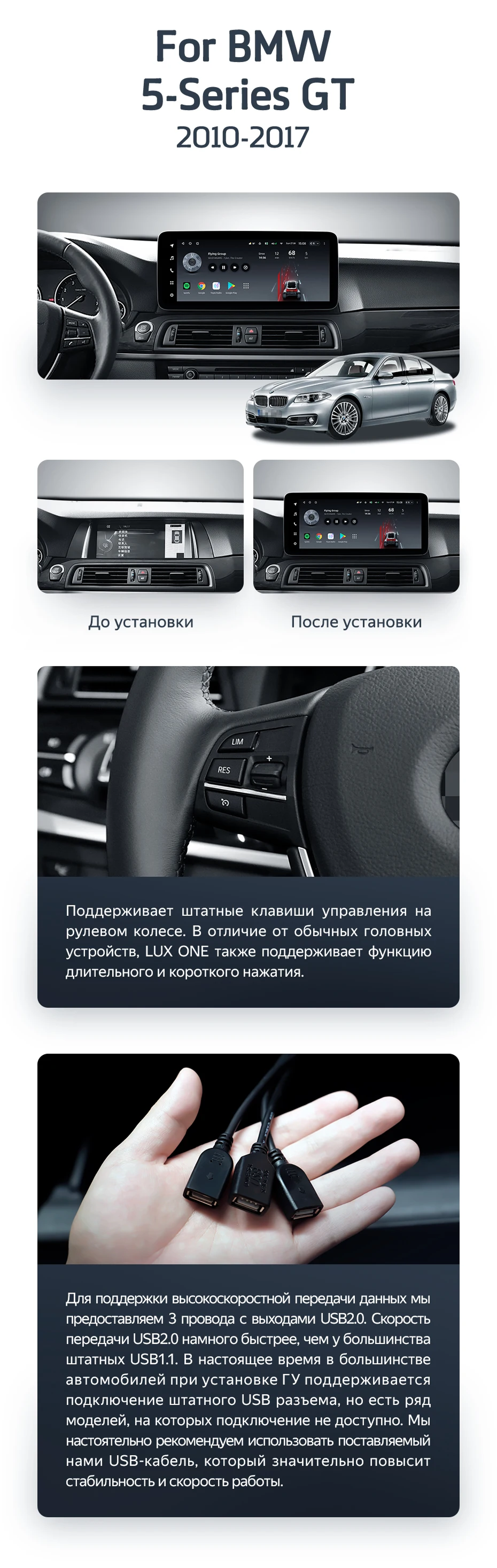 Готовый установочный комплект для магнитолы BMW 5-Series Gran Turismo F07 (NBT) (2013-2017) 12,3 дюйма в штатное место, включает переходную рамку и проводку.