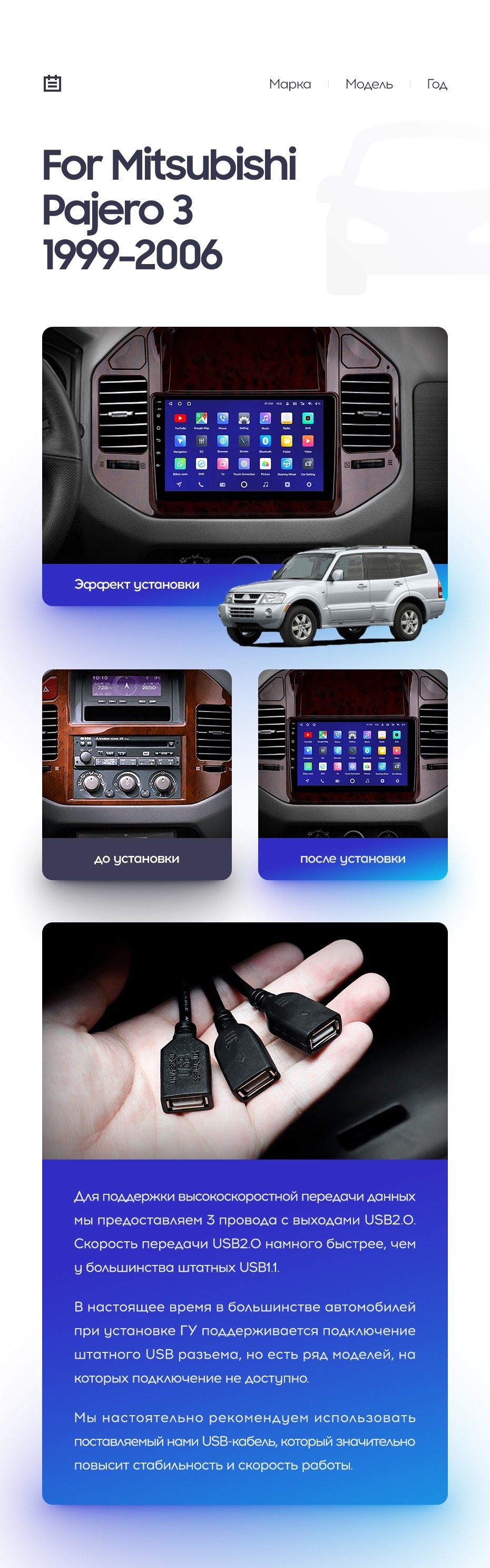 Установочный комплект для Mitsubishi Pajero 3 V70 V60 (1999-2006) включает переходную рамку и проводку.