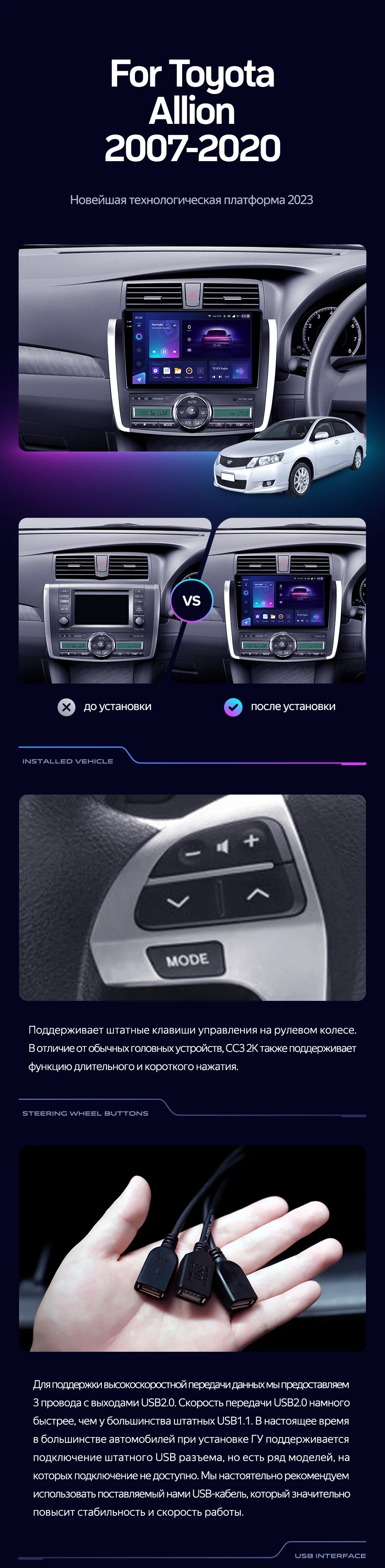 Полный комплект установки магнитолы Teyes с рамкой и проводкой можно выбрать в каталоге штатных магнитол Toyota Allion T260 (2007-2020).
