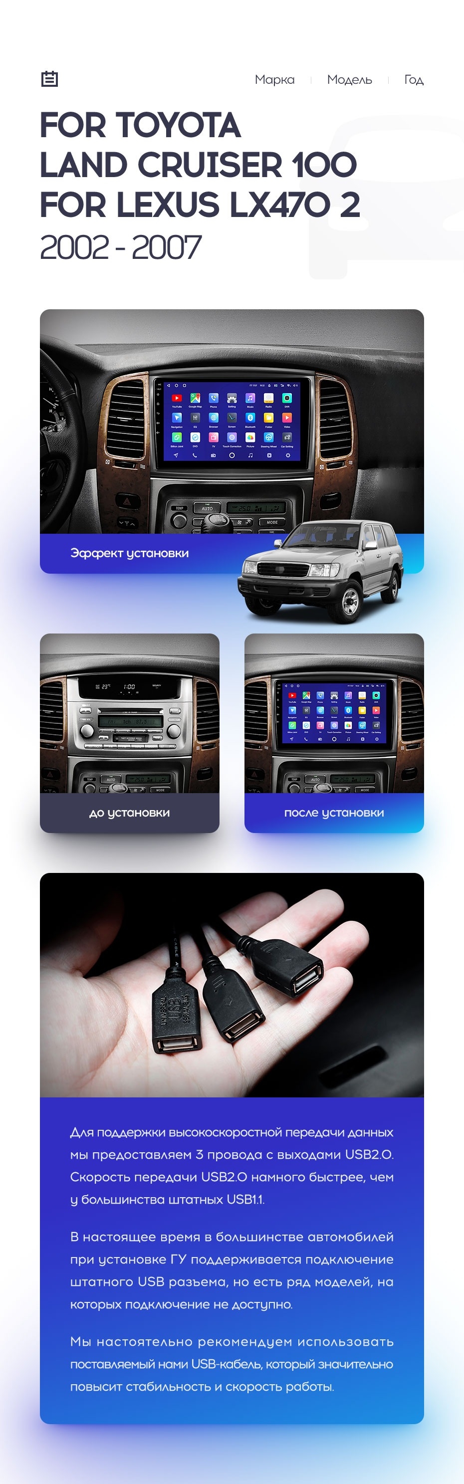 Полный комплект установки магнитолы Teyes с рамкой и проводкой можно выбрать в каталоге штатных магнитол Lexus LX470 J100 2 (2002-2007).
