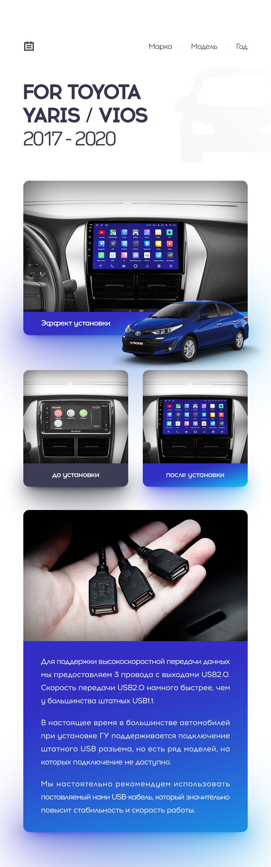 Установочный комплект для Toyota Yaris (2017-2020) включает переходную рамку и проводку.