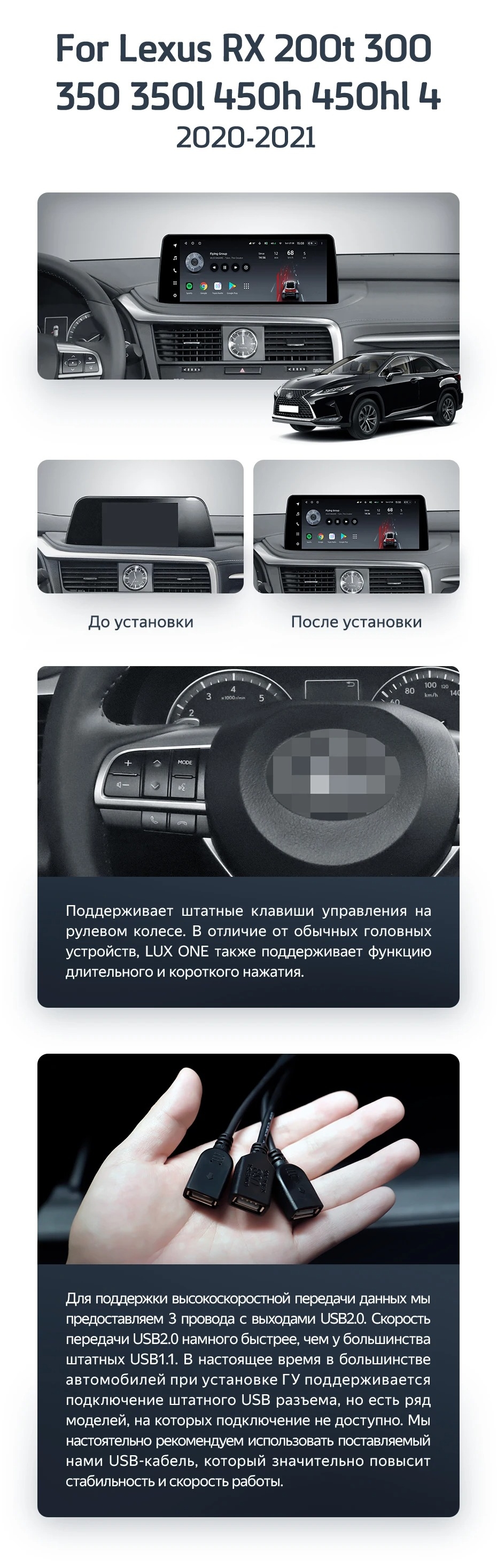 Установочный комплект для Lexus RX200t RX300 RX350 RX350l RX450h RX450hl AL20 IV (2020-2021) включает переходную рамку и проводку.