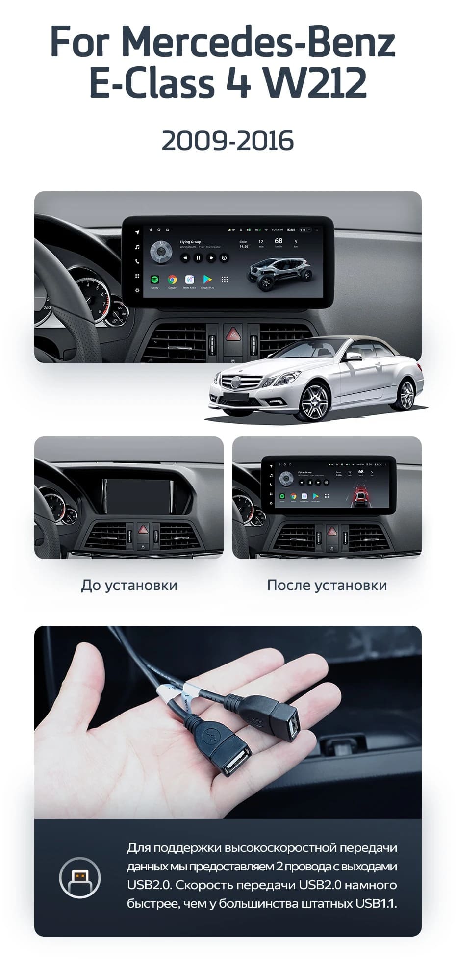 Установочный комплект для Mercedes-Benz E-Class 4 W212 S207 A207 S212 C207 (NTG 5.0) (2014-2023) включает переходную рамку и проводку.