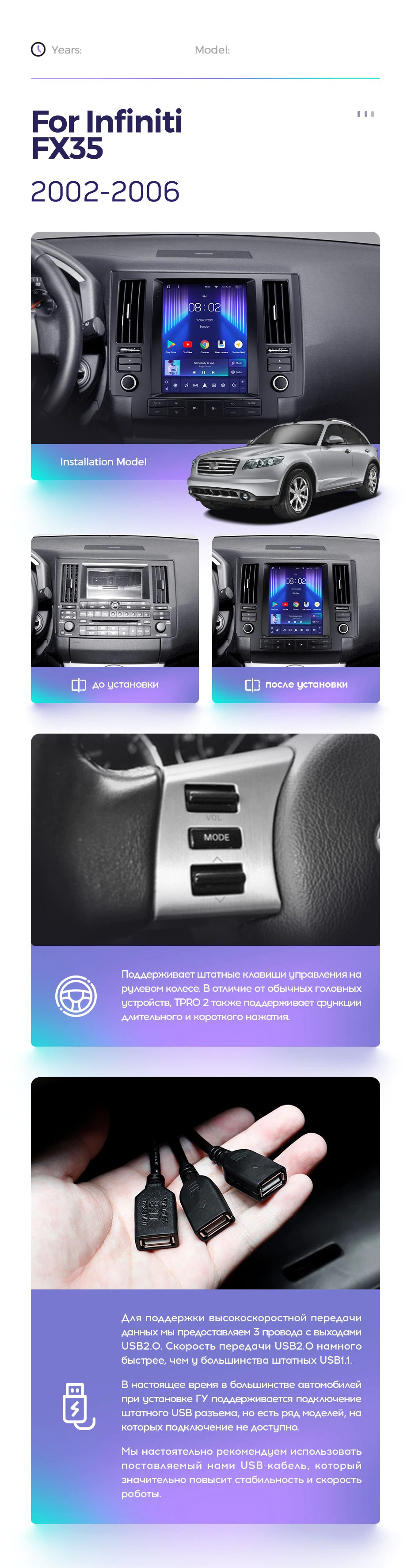 Полный комплект установки магнитолы Teyes с рамкой и проводкой можно выбрать в каталоге штатных магнитол Infiniti FX35 1 2002-2006.